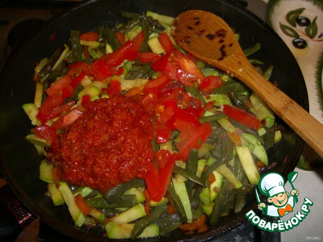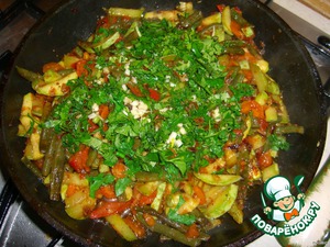как кабачки станут мягкие, добавляем помидоры, зелень. так как у меня был всего лишь один помидорчик, я добавила еще пару ложек аджики домашней