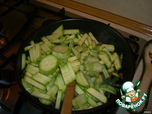 затем кабачки, я огонь сильно не уменьшаю, постоянно помешиваю