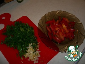 затем помидоры соломкой, чеснок, зелень, у меня был и укроп, петрушка, кинза