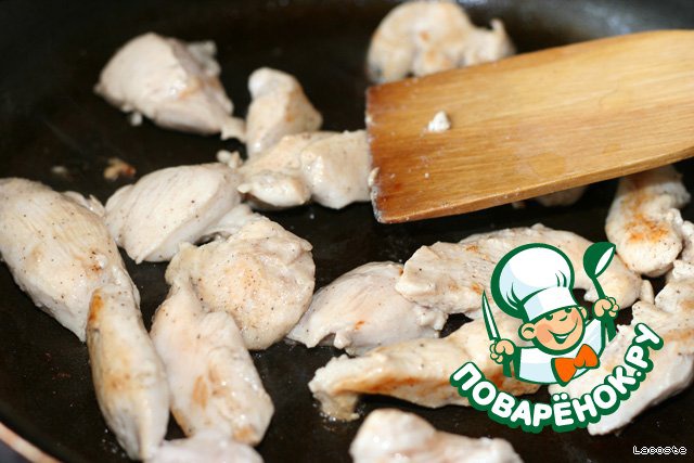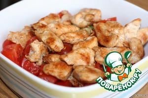Добавить помидоры черри (нарезанные половинками) и обжаренные кусочки курицы.