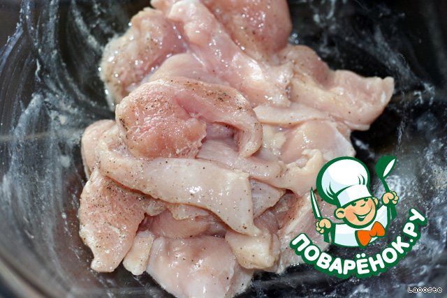 Филе нарезать небольшими кусочками. Замариновать в лимонном соке и специях. Оставить на 15-20 минут.