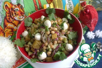Из оливкового масла и бальзамического уксуса (количество по вкусу) сделать заправку. Полить заправкой салат. Оставить на 15-20 минут на холоде, и затем подать к столу.