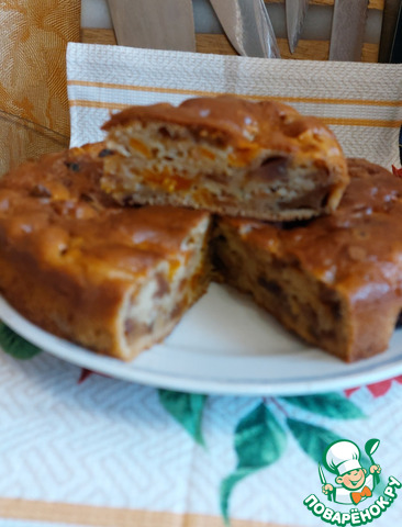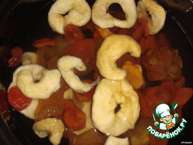 Сухофрукты замочить в холодной воде на 30 минут (у меня были сушеные яблоки, груши, курага).