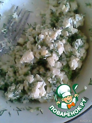 • Смешивает творог, сыры, яйцо, укроп, соль.