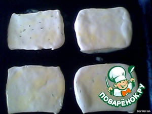 • Тесто нарезаем на прямоугольники или квадраты. у меня тесто продается в виде пластов, на 1кг - 4 пласта. то есть 8 прямоугольников или 12квадратов.