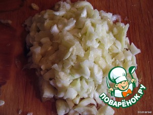 В фарш добавляем измельченный в блендере лук и измельченную серединку кабачка, солим, перемешиваем.