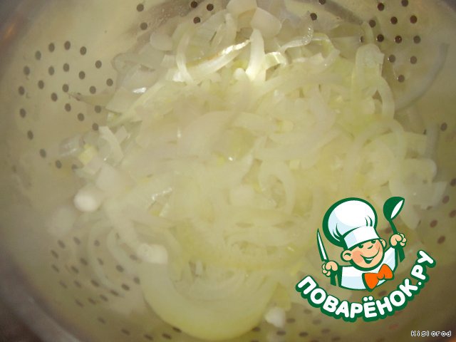 Когда лук закипит, сливаем с него воду (если вы хотите, чтобы лук был очень мягким, то проварите его подольше).