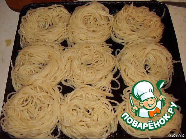 Смазываем противень маслом и с помощью вилки формируем гнезда.