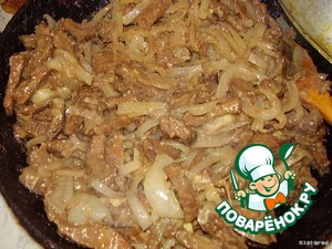 Когда печень слегка обжарится, добавляем к ней лук, слив с него уксус