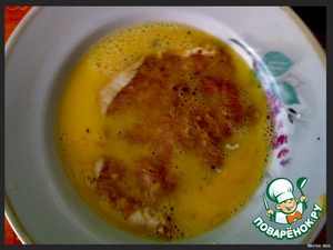 Спустя час, берем промаринованное мясо. Взбиваем в тарелке яйцо, в другую насыпаем муку.