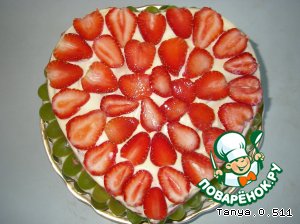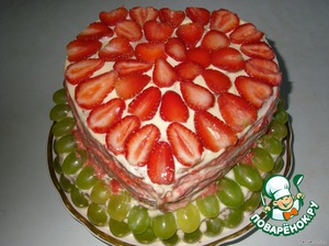 Сверху украшаем клубникой,а круглый корж вокруг оформляем виноградом.