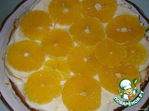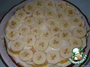 Затем второй корж-крем-апельсины-крем-бананы-крем.