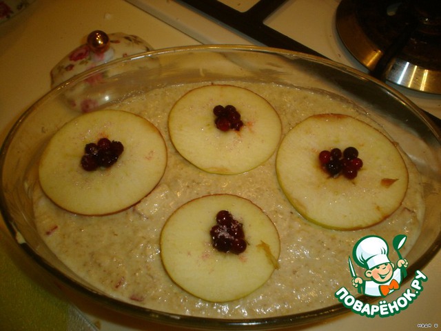 Выложить нашу смесь в форму,положить сверху яблочные кружки.А дырочки в кружках я заполнила брусникой.