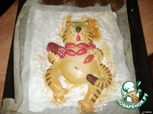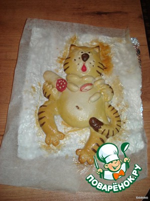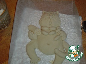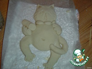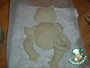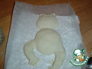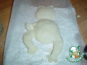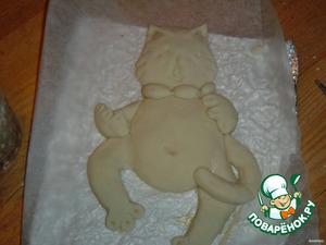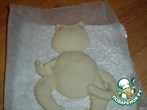После того как тесто готово, начинаем процесс лепки. На пергамент для выпечки выкладываем "тело" и "голову" кота. -