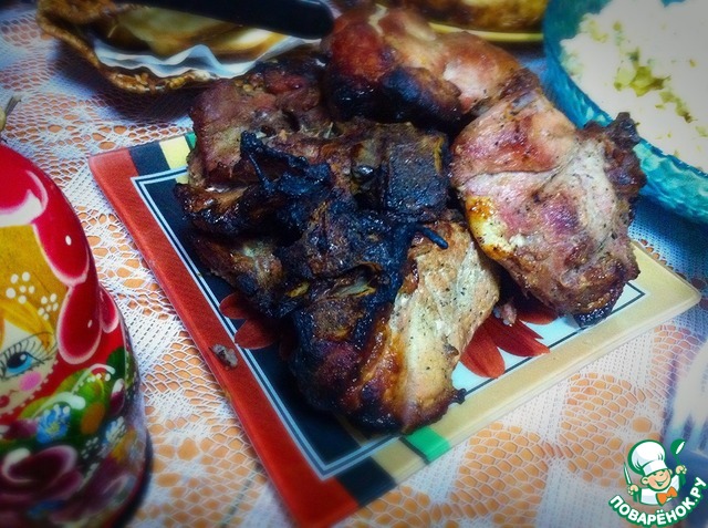 Жарим в духовке до готовности. Периодически переворачивайте, чтобы пропитывалось соусом.