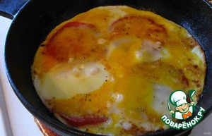Закрыть сковороду крышкой и выключить огонь (на чугунной сковородке яичница сама доходит), или оставить на слабом огне, если тонкая сковородка.