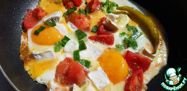 Яичница с томатами. Помидоры (ломтики пластинками) обжарить с обеих сторон, залить яйцом, расплавить сыр и зелень по-вкусу.