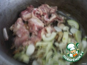 Нарежем свиные шкурки на кусочки и поставим топится в казанок до румяного цвета.