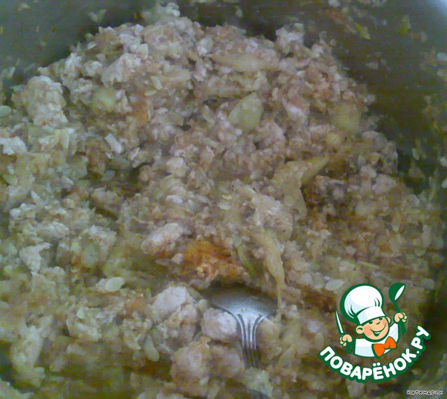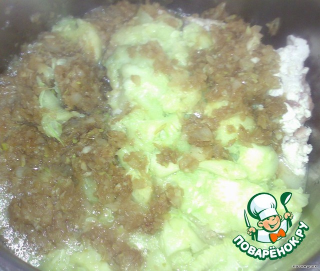 4.Фарш,мякоть кабачка,лук,высыпаем в кастрюльку. Все перемешиваем.