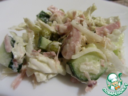 Высыпаем горошек (я не добавляла, потому что капусты положила побольше). Заправка может быть любая, я взяла свою любимую: оливковое масло + лимонный сок, немного соли и специй – по Вашему вкусу. Приятного аппетита!