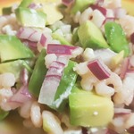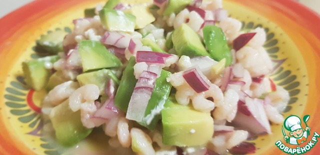 В салатнице перемешать креветки, авокадо и лук,