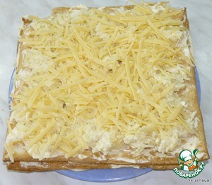• Картофель натереть на терке и смешать с небольшим количеством майонеза. Распределить начинку поверх второго коржа.