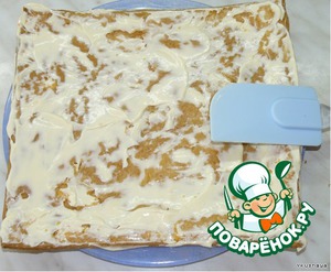 • Сметану смешать с майонезом. Обмазать этой смесью коржи с обеих сторон.
