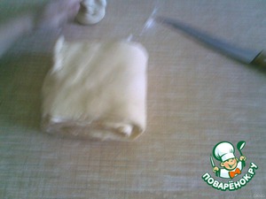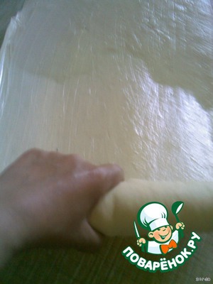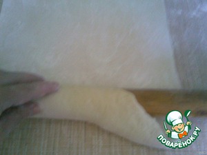 Раскатав длинный тонкий пласт смазываем его мягким маслом или маргарином весь! :)