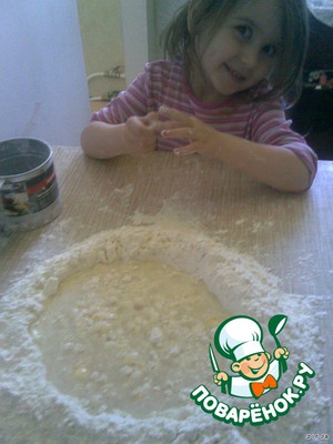 Высыпаем муку, делаем ямку. В воду добавляем соль и уксус, размешиваем. В ямку вбиваем яйца и выливаем воду-замешиваем тесто. Такое как на пельмени только помягче.