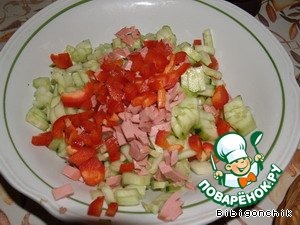 Овощи, ветчину, сырок плавленный порезать и заправить майонезом.