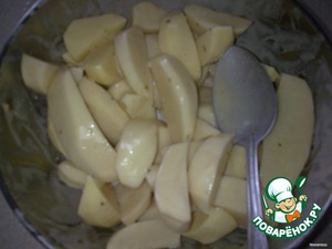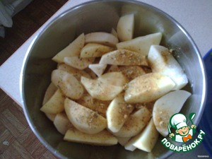 Картофель почистить, помыть и нарезать на 4 части.Посыпать приправами