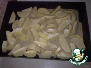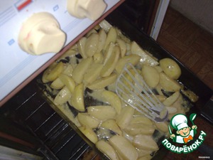 Выложить картофель на противень(маслом не смазывать) и поставить в духовку.