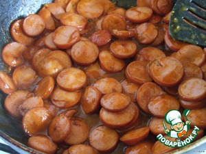 В сковороду выложить порезанные кружками сосиски и жарить, периодически помешивая, пока они не подрумянятся. Добавить томатную пасту и все хорошо перемешать.