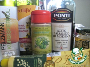 В соуснике хорошо перемешиваем оливковое масло, бальзамический уксус, мёд, горчицу, тыквенное масло, соль, перец;
