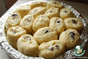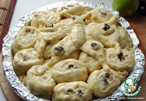 Для начинки: замочить изюм в кипятке на 5-7 минут, мелко порезать.