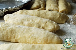 Для теста: Муку просеять, добавить разрыхлитель и дрожжи, перемешать. Смешать молоко, сахар и масло, добавить муку, соль и 1 яйцо, замесить тесто.