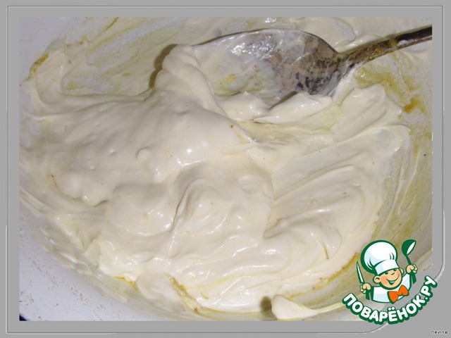 • Смешать сметану + майонез и заправить салат.Сверху украшение желток(через мелкую терку).Дать настояться салату.
