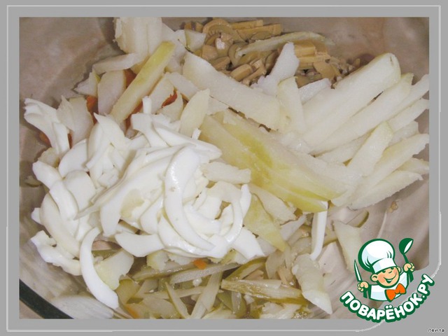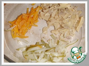 • Нарезать соленый огурец,марин.грибы,морковь из рассола.