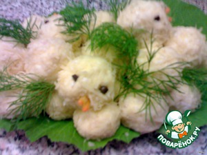 Можно сделать из морковки клювики, из маслинок глазки и украсить укропом.