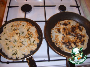 Залить тонким слоем теста, обжарить сначала с одной стороны.