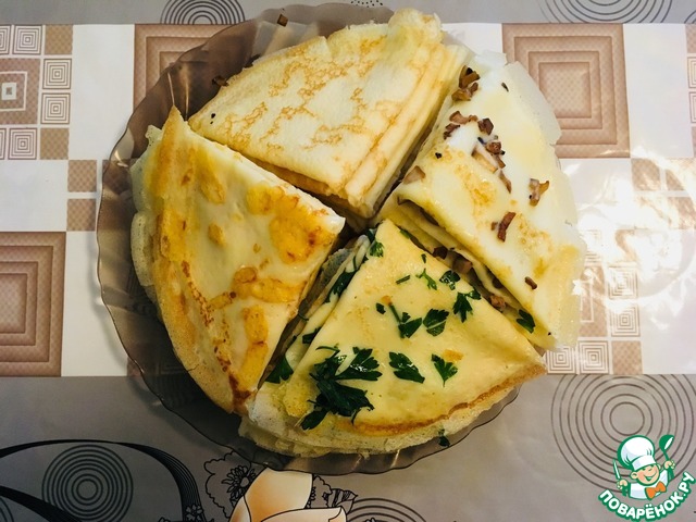 Блины традиционное главное блюдо русской кухни. Захотелось блинов с начинкой. Решила вспомнить один из рецептов блины с припeком. Этот вариант удобен и быстр в приготовлении. Порадует Ваших домашних, им предоставиться возможность выбрать свой вкус. Получаешь сразу горячий блинчик и любую начинку по желанию. Творчество для выбора припeка не ограниченно. Я готовила с традиционными начинками в русской кухне. Получились блины "4 вкуса" горячие, ароматные, сытные.