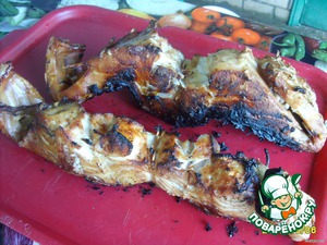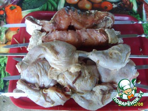 Нанизываем рыбу и курицу, причём у рыбки надо вырезать крупную позвоночную косточку, и нанизать как гармошечку на шампур. Курицу пронизываем в двух местах - в бёдрышко и в ножку, поближе к кости.