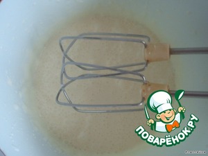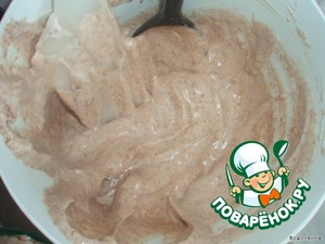 Теперь снова приготовить желатин(1 пач. в 50мл. воды). Отделить белки от желтков.Белки взбиваем в крутую пену с сахаром. Берем молоко немного подогреваем его и разводим в нем 3ч.л какао( в теплом молоке какао лучше растворяется)+ сахар (по вкусу) + ванильный сахар+ разведенный желатин+ аккуратно взбитые белки. Все это хорошо вымешать.