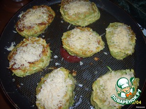 Когда одна сторона обжарится, перевернём и посыпем обжаренную сторону тёртым сыром.
