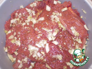 Натереть кусочки сердца густо этой смесью. Соль, перец и другие приправы смешать с луком и чесноком.. Сложить наше сердце в миску накрыть тарелкой и оставить на ночь ( в холодильник можно не убирать)