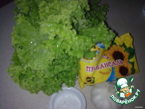 Листья салата тщательно промыть. Разложить на тарелку поштучно в один слой. Солим. Трём сверху примерно пол зубчика чеснока.