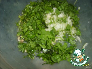 Зелень мелко режем, огурец трём на крупной тёрке. Трём на мелкой тёрочке чеснок.