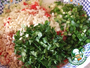 • Репчатый лук и зелень мелко порезать. Чеснок пропустить через пресс. Все перемешать и поставить настояться в холодильник на 1 час.