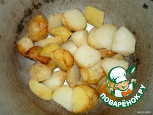 Картофель почистить,порезать кусочками и обжарить в растительном масле до золотистой корочки.
