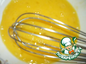 В стакане кефира погасить 0,5 ч. л. соды, вылить в масло, добавить сахар, размешать.